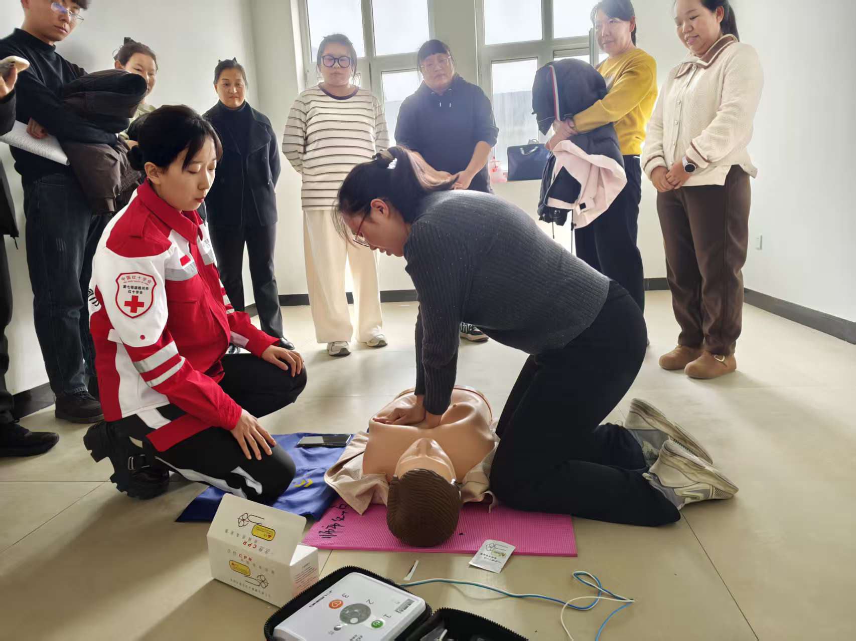 培训紧密围绕“掌握应急技能,守护生命安全”的主题展开。第七师胡杨河市红十字会应急救护培训师资团队为学员们系统讲授了应急救护基础理论、心搏骤停识别、心肺复苏(CPR)操作流程、自动体外除颤器(AED)的使用方法、气道异物梗阻急救、创伤止血包扎等核心知识与技能。课程采用“理论讲解+实操练习+考核认证”的模式,重点突出实操性。在救护师资的悉心指导下,学员们认真听讲、反复练习,熟练掌握了心肺复苏的按压深度、频率以及AED的操作步骤。